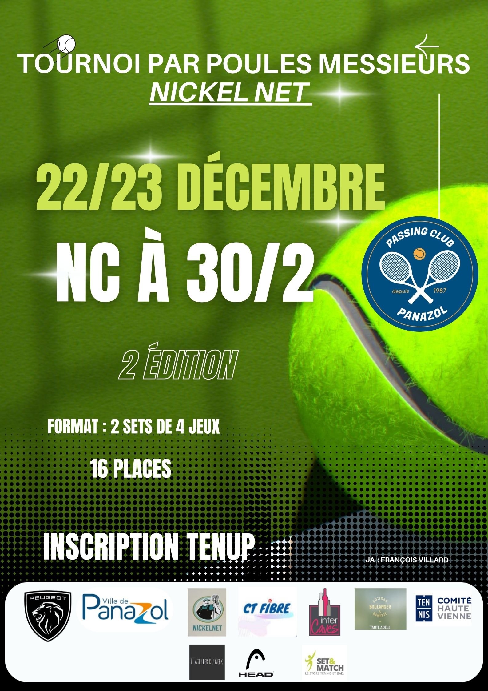 NOS TOURNOIS Tournoi du club à l’affiche! Prochains tournois ici ! Vous pouvez vous inscrire directement par les boutons ci-dessous. TOURNOI PAR POULE de NC à 30/2 : 22 ET 23 DECEMBRE TOURNOI OPEN HIVER, SENIOR/+ 35 ANS/+ 55 ANS : 7 FEVRIER AU 22 FEVRIER TOURNOI + DE 60 ANS MESSIEURS, NC à 30/1 : 26 ET 27 MARS TMC ADULTES DU MOIS D'AVRIL : HOMOLOGATION EN COURS